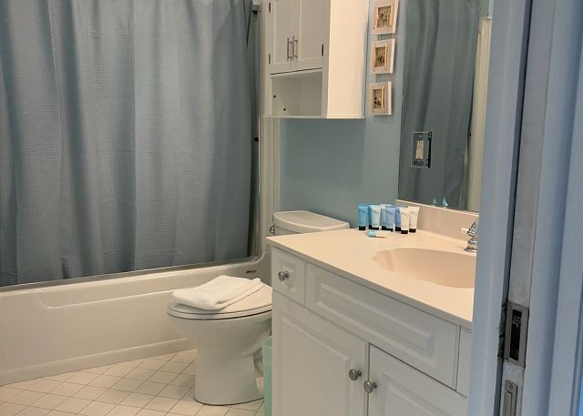 The large primary bedroom with King size bed commands another great ocean view and provides private access to the covered porch. The spacious primary bath has a Jacuzzi tub, walk-in shower, and double sink vanity. One guest bedroom is also on this floor, with 2 Queen beds and a TV. It has access to a full hall bath with a tub/shower combo. The laundry room is on this floor as well.