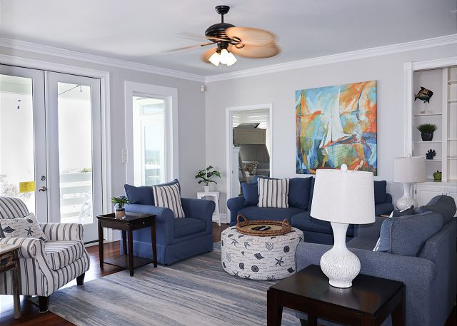 On the first floor, the living room offers a spectacular ocean view as well as comfortable seating, a 42" flat panel TV, and access to the covered porch and boardwalk beyond. Also, on this floor is the dining room with a dining table and chairs to seat 8 people and a sliding glass door to the porch. The open, airy kitchen features a large connected countertop; making meal preparation and serving the kids a breeze. The full-size, side-by-side refrigerator, smooth top electric range with a built-in microwave above, and dishwasher make preparing your favorite home-cooked recipes easy.